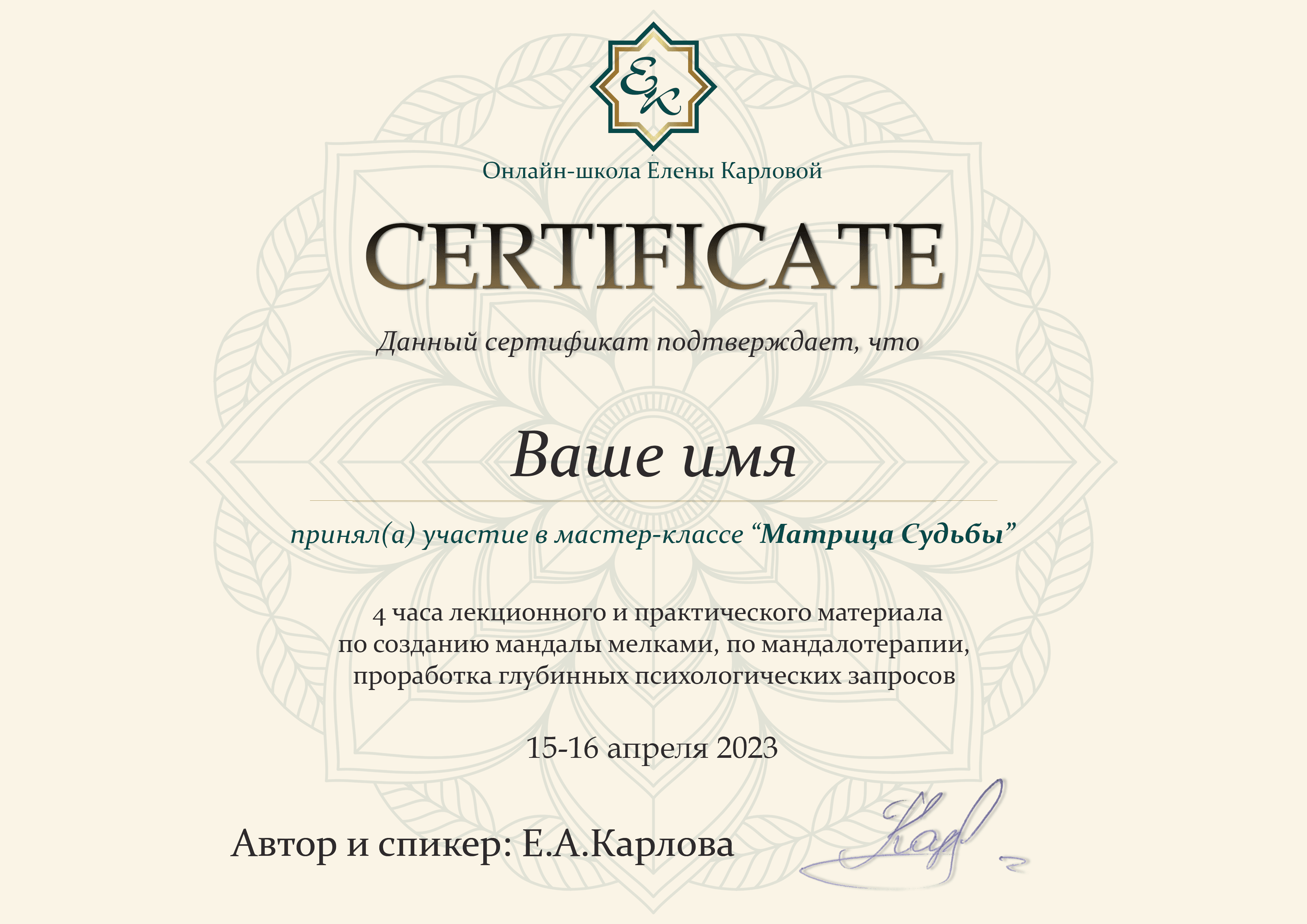 Процесс создание мандалы должен доставлять удовольствие, все должно проходить через осознания, принятие. Елена Карлова на мастер-классе даст техники и практики: как человеку осознать свои деструктивные программы, а осознав их - трансформировать и изменить на положительные сценарии жизни и уже благодаря этому создать “Матрицу Судьбы”.
